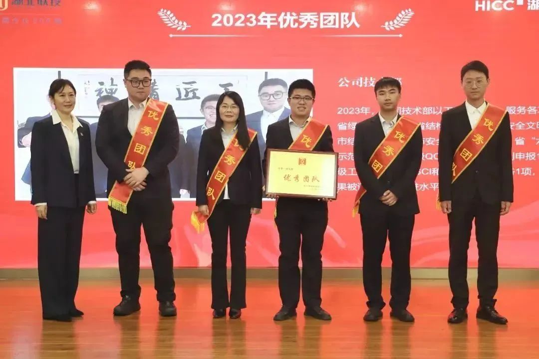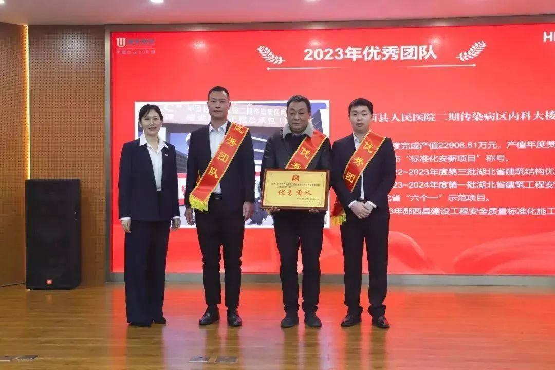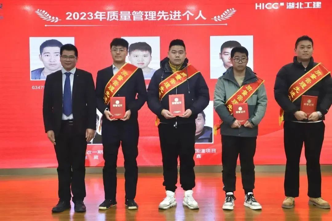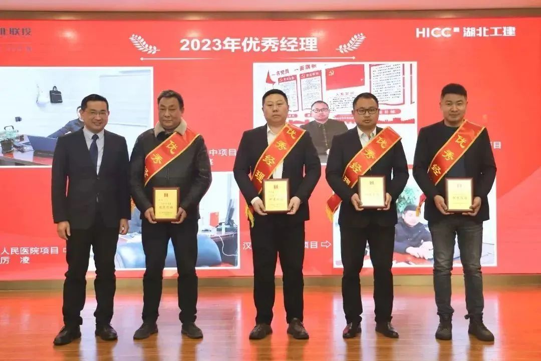胡超宣讀了《關(guān)于表彰湖北工建基礎(chǔ)設(shè)施建設(shè)有限公司2023年度先進(jìn)的決定》,公司領(lǐng)導(dǎo)班子成員依次為獲得2023年度“優(yōu)秀團(tuán)隊(duì)獎(jiǎng)”“優(yōu)秀供應(yīng)商”“優(yōu)秀經(jīng)理獎(jiǎng)”“優(yōu)秀員工獎(jiǎng)”“新人成長(zhǎng)獎(jiǎng)”“安全生產(chǎn)先進(jìn)個(gè)人獎(jiǎng)”“質(zhì)量管理先進(jìn)個(gè)人獎(jiǎng)”的代表頒發(fā)榮譽(yù)證書和獎(jiǎng)牌。